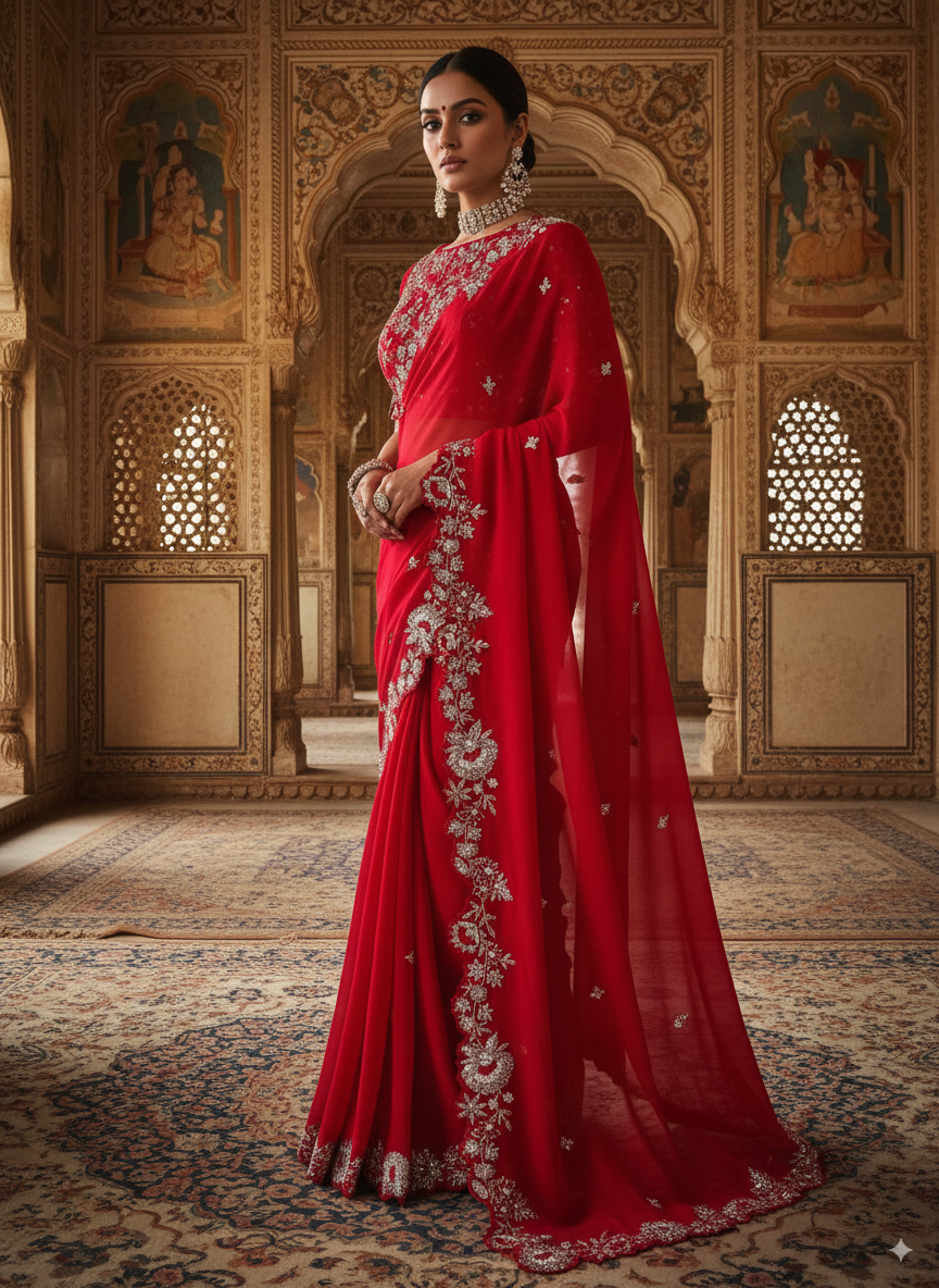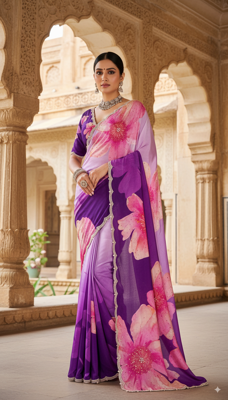 This vibrant drape captures the essence of blooming beauty, blending the softness of pure silk with striking hand-painted florals. Designed for women who embrace both tradition and modern artistry, it’s a statement of grace, charm, and individuality. Perfect for celebrations where you wish to stand out while carrying timeless elegance.